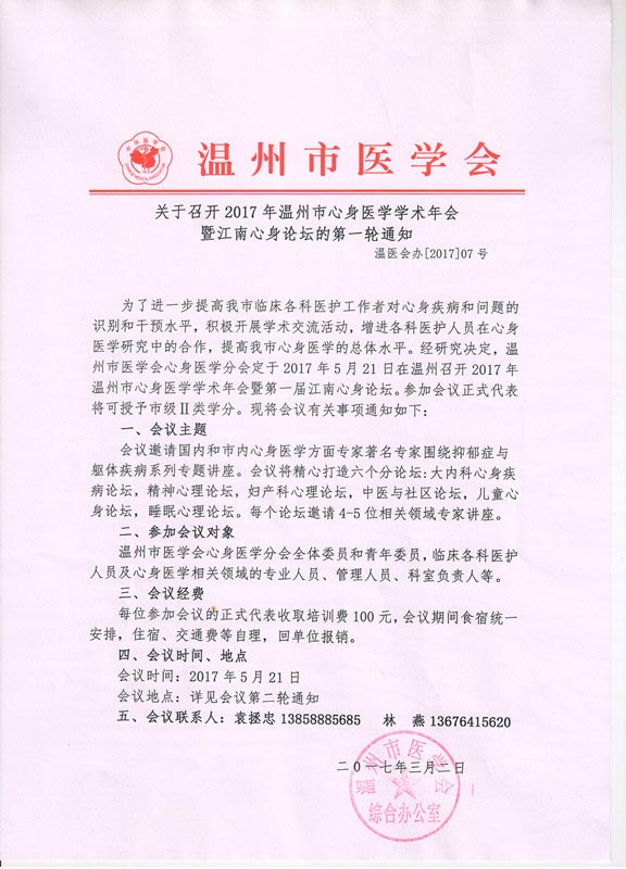 关于召开2017年温州市心身医学学术年会暨江南心身论坛的第一轮通知