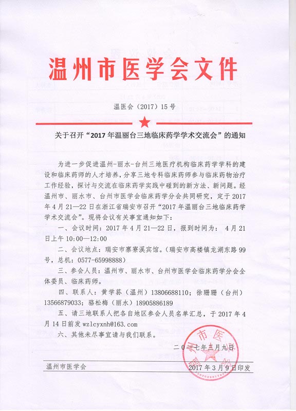 关于召开“2017年温丽台三地临床药学学术交流会”的通知