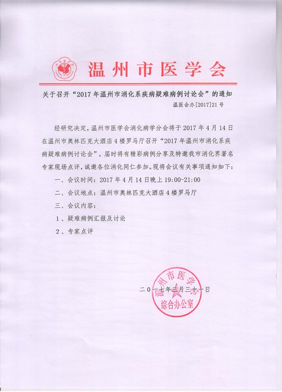 关于召开“2017年温州市消化系疾病疑难病例讨论会”的通知