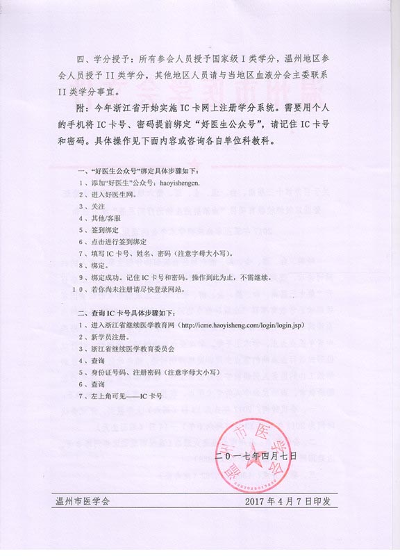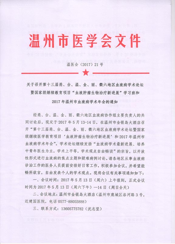 关于召开第十三届甬、台、温、金、丽、衢六地区血液病学术论坛暨国家级继续教育项目“血液肿瘤生物治疗新进展”学习班和2017年温州市血液病学术年会的通知