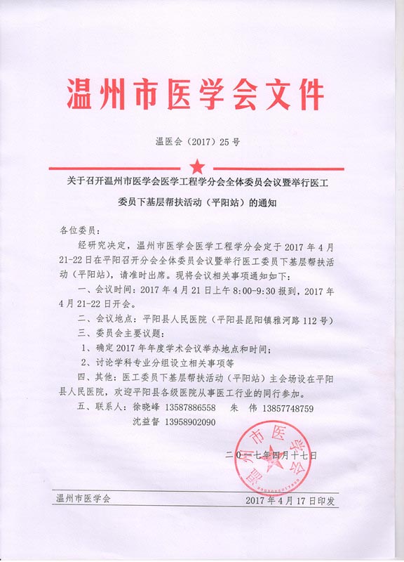 关于召开温州市医学会医学工程学分会全体委员会议暨举行医工委员下基层帮扶活动(平阳站)的通知