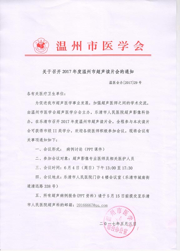 关于召开2017年度温州市超声读片会的通知