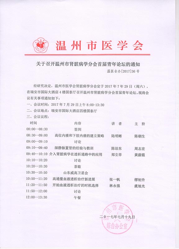 关于召开温州市肾脏病学分会首届青年论坛的通知