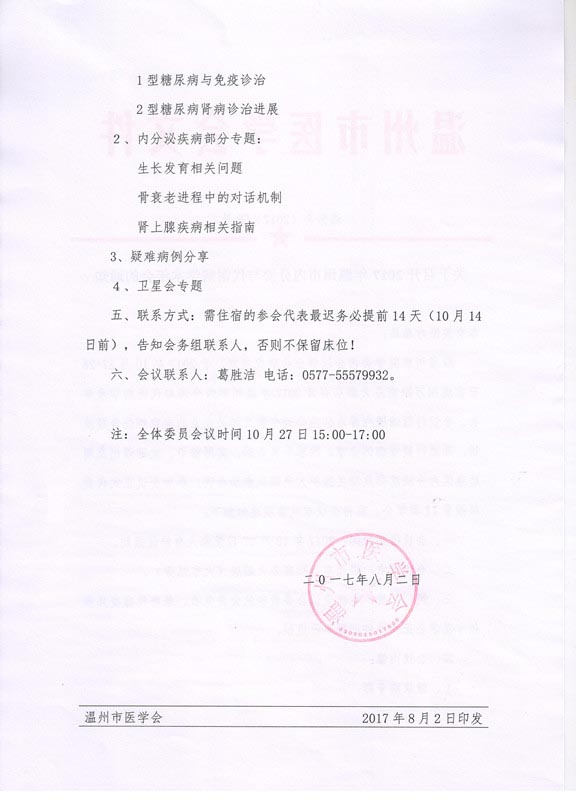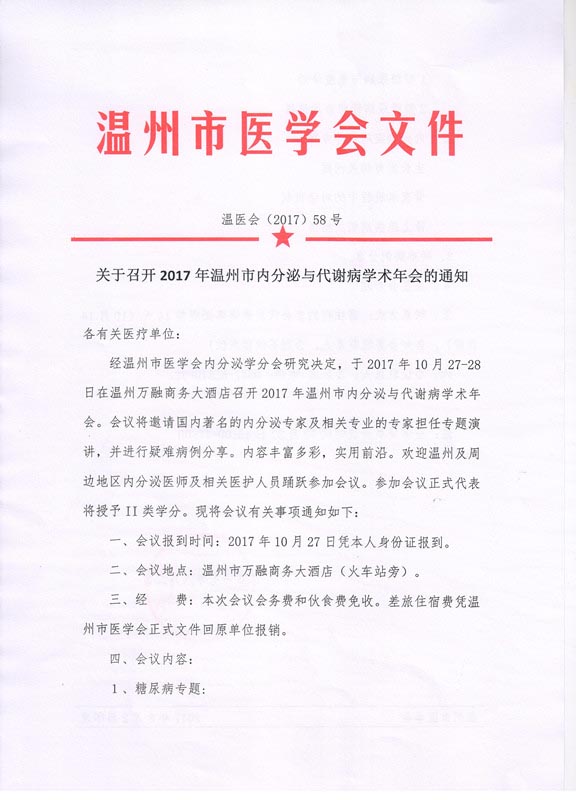 关于召开2017年温州市内分泌与代谢病学术年会的通知