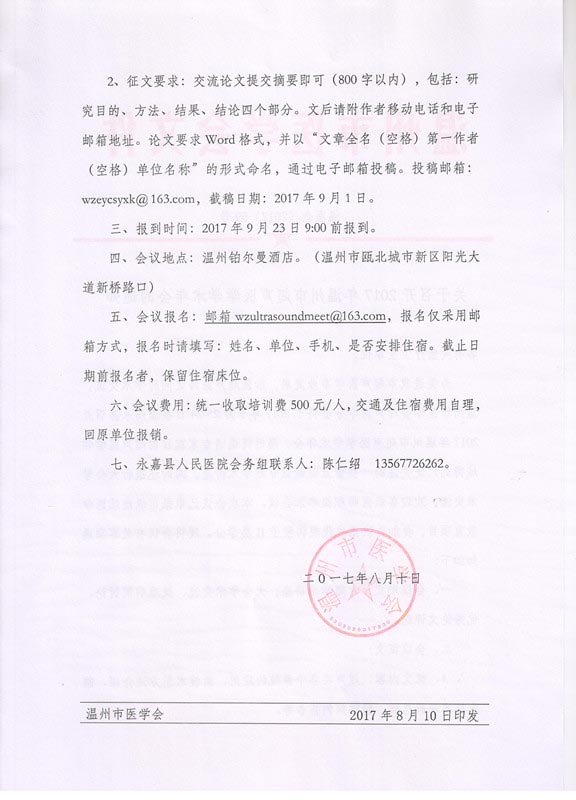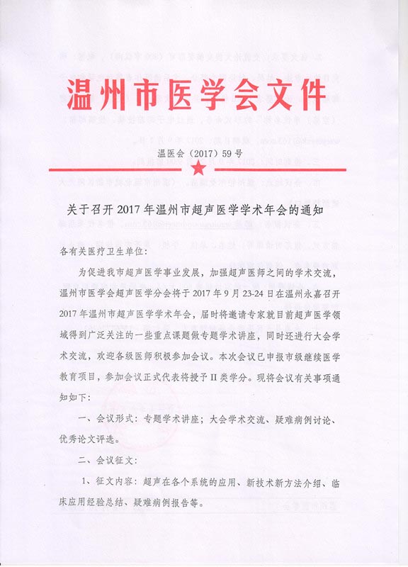 关于召开2017年温州市超声医学学术年会的通知