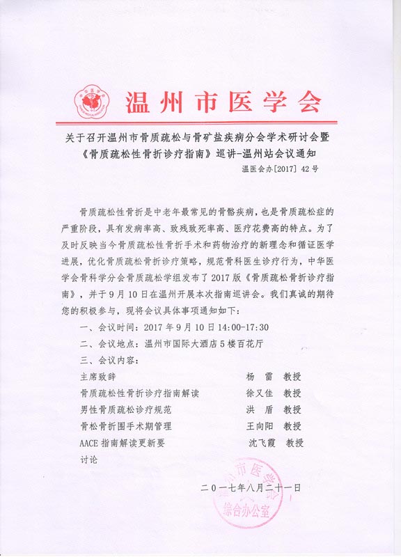 关于召开温州市骨质疏松与骨矿盐疾病分会学术研讨会暨《骨质疏松性骨折诊疗指南》巡讲-温州站会议通知
