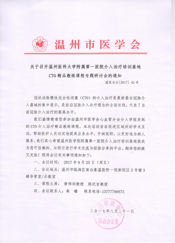 关于召开温州医科大学附属第一医院介入治疗培训基地CTO精品教练课程专题研讨会的通知