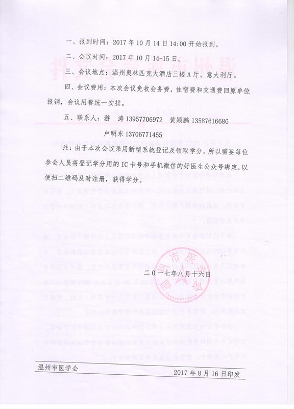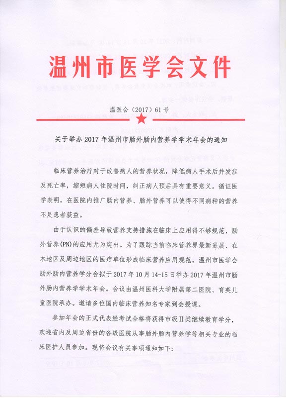 关于举办2017年温州市肠外肠内营养学学术年会的通知