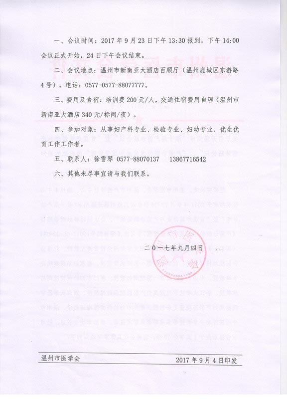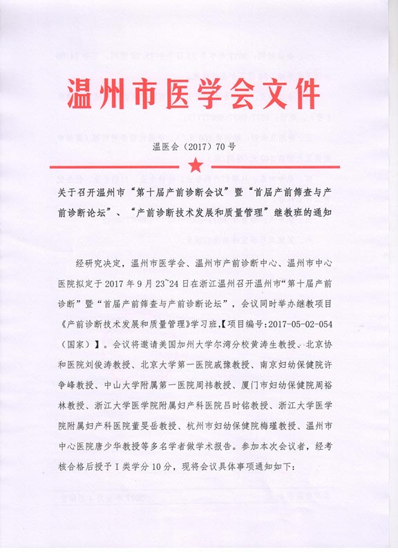 关于召开温州市“第十届产前诊断会议”暨“首届产前筛查与产前诊断论坛”、“产前诊断技术发展和质量管理”继教班的通知
