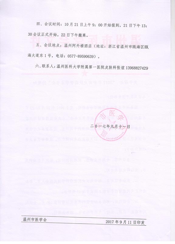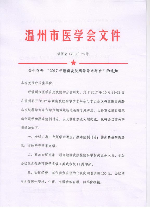 关于召开“2017年浙南皮肤病学学术年会”的通知
