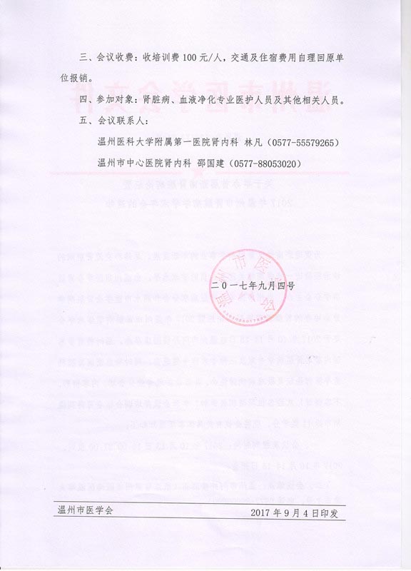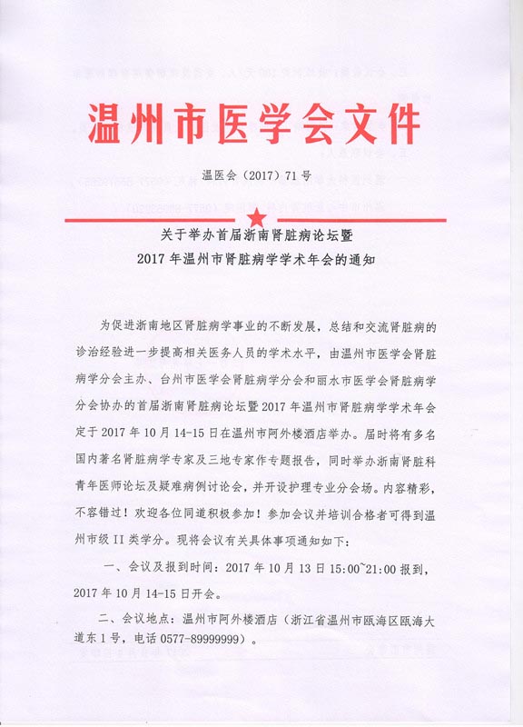 关于举办首届浙南肾脏病论坛暨2017年温州市肾脏病学学术年会的通知