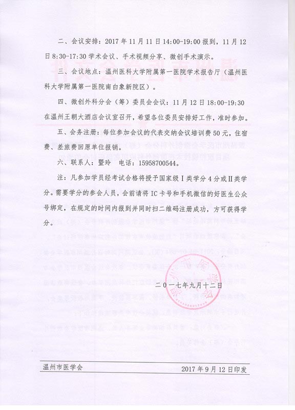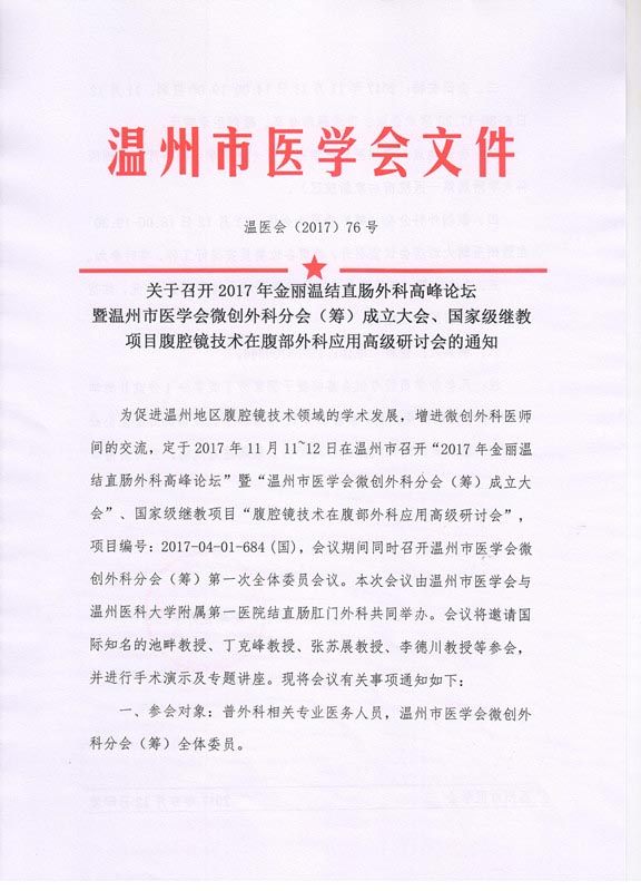关于召开2017年金丽温结直肠外科高峰论坛暨温州市医学会微创外科分会(筹)成立大会、国家级继教项目腹腔镜技术在腹部外科应用高级研讨会的通知