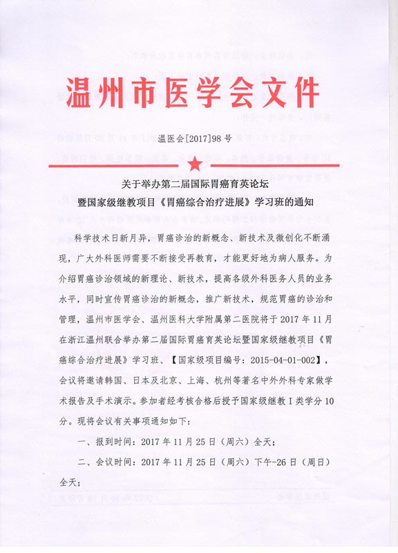 关于举办第二届国际胃癌育英论坛暨国家级继教项目《胃癌综合治疗进展》学习班的通知