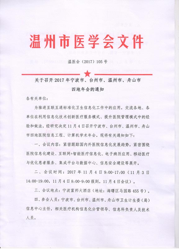 关于召开2017年宁波市、台州市、温州市、舟山市四地年会的通知