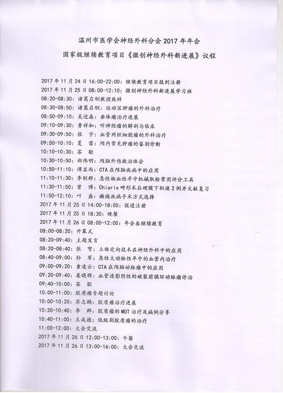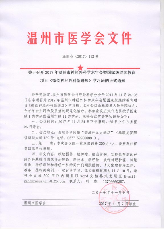 关于召开2017年温州市神经外科学术年会暨国家级继续教育项目《微创神经外科新进展》学习班的正式通知