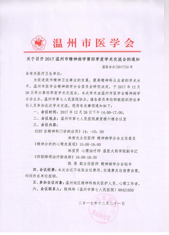 关于召开2017温州市精神病学第四季度学术交流会的通知