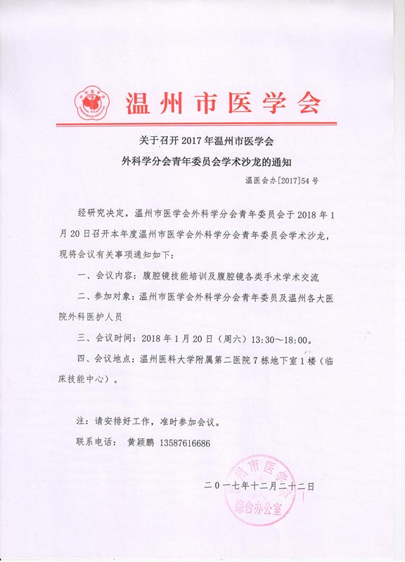 关于召开2017年温州市医学会外科学分会青年委员会学术沙龙的通知