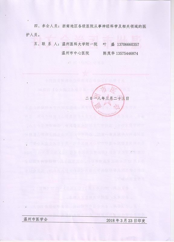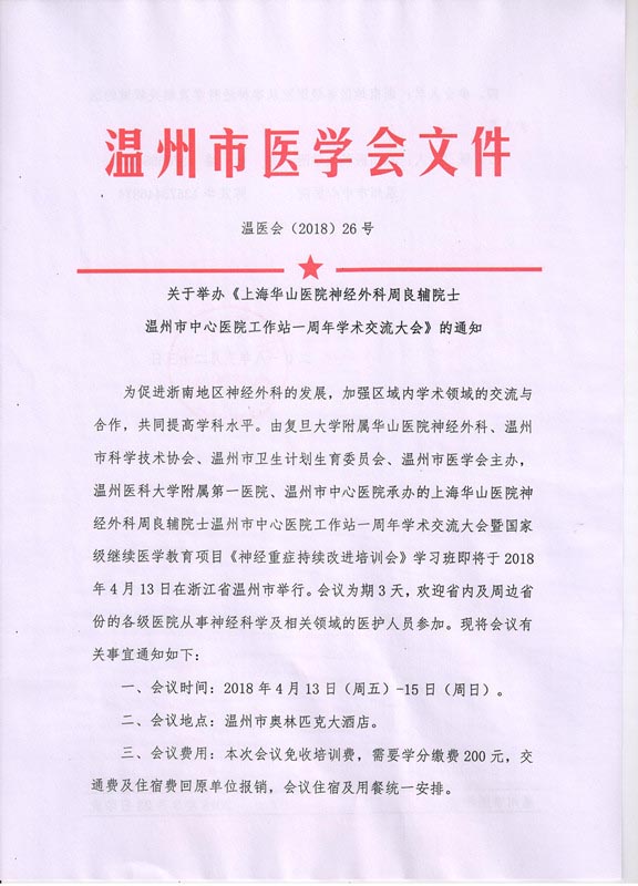 关于举办《上海华山医院神经外科周良辅院士温州市中心医院工作站一周年学术交流大会》的通知