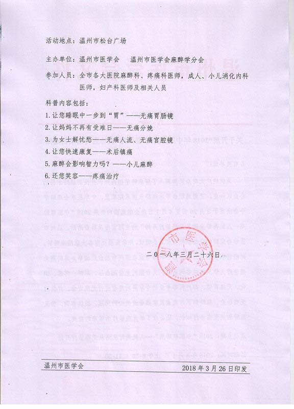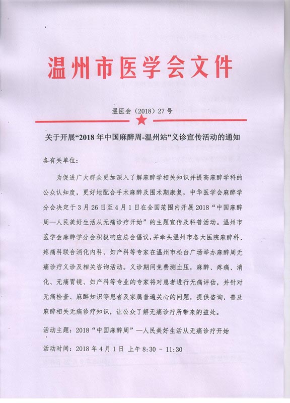 关于开展“2018年中国麻醉周-温州站”义诊宣传活动的通知