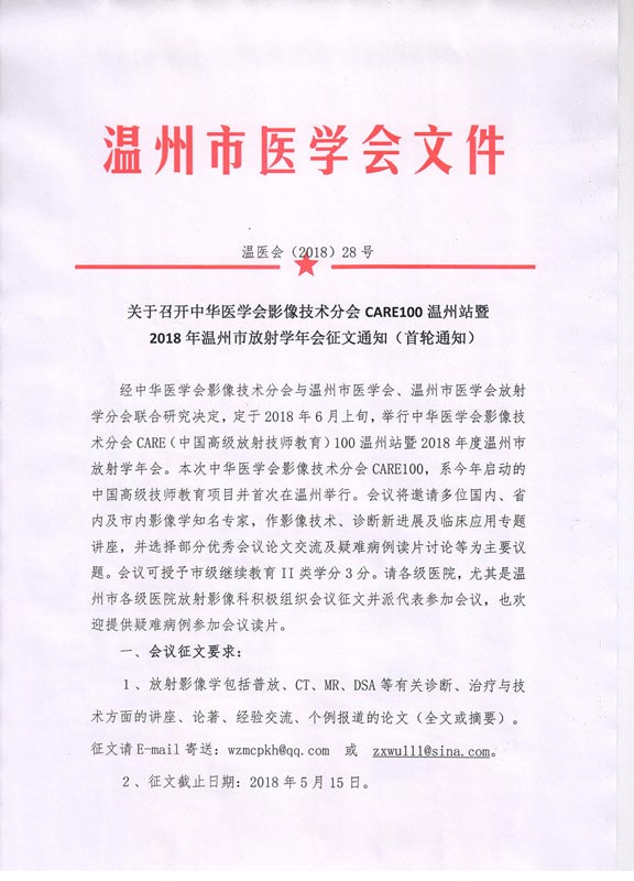 关于召开中华医学会影像技术分会CARE100温州站暨2018年温州市放射学年会征文通知(首轮通知)