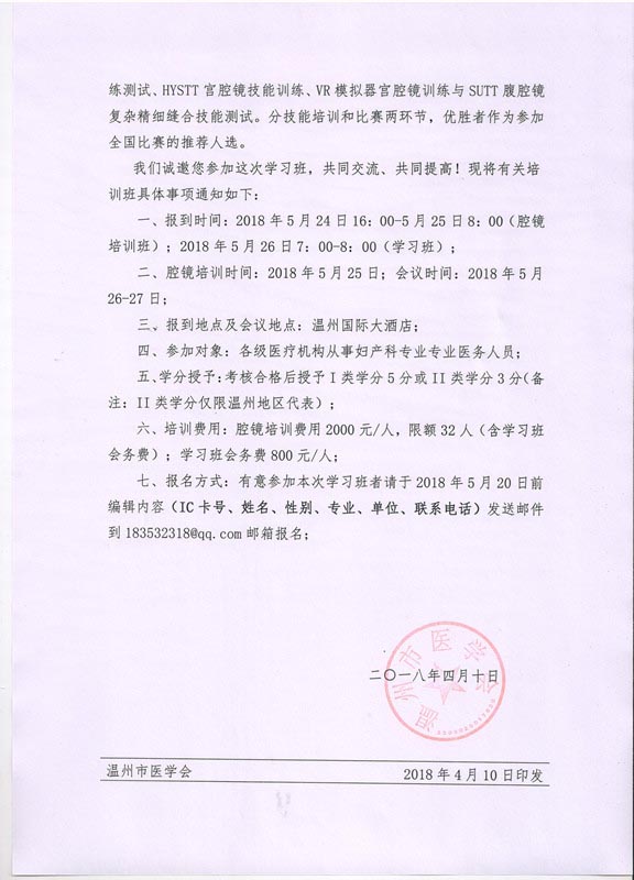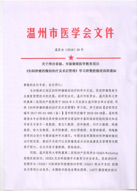 关于举办省级、市级继续医学教育项目《妇科肿瘤的微创治疗及术后管理》学习班暨腔镜培训班通知