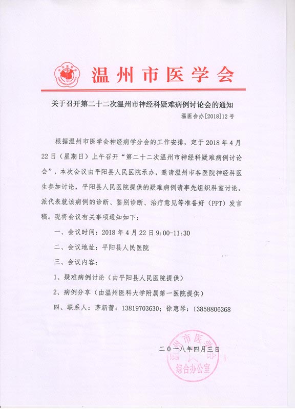 关于召开第二十二次温州市神经科疑难病例讨论会的通知