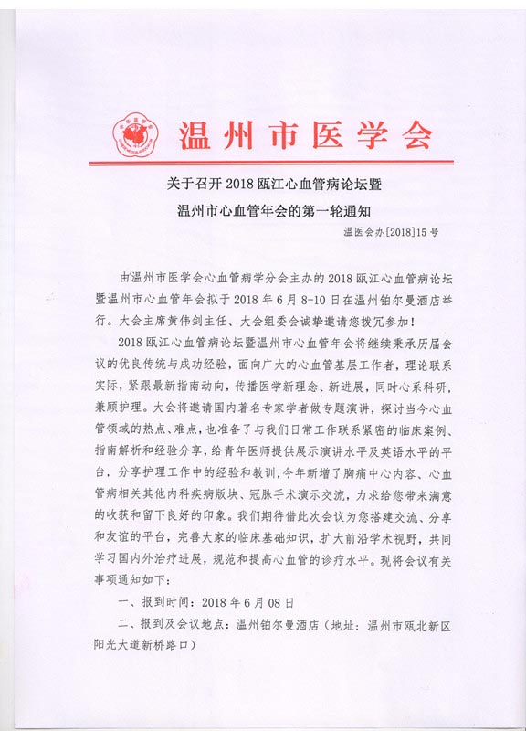 关于召开2018瓯江心血管病论坛暨温州市心血管年会的第一轮通知