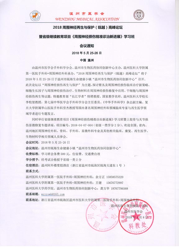 2018周围神经再生与保护(瓯越)高峰论坛暨省级继续教育项目《周围神经损伤精准诊治新进展》学习班会议通知