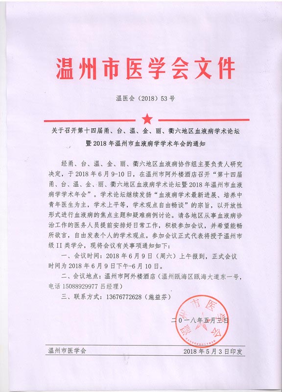 关于召开第十四届甬、台、温、金、丽、衢六地区血液病学术论坛暨2018年温州市血液病学学术年会的通知