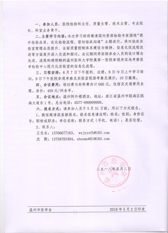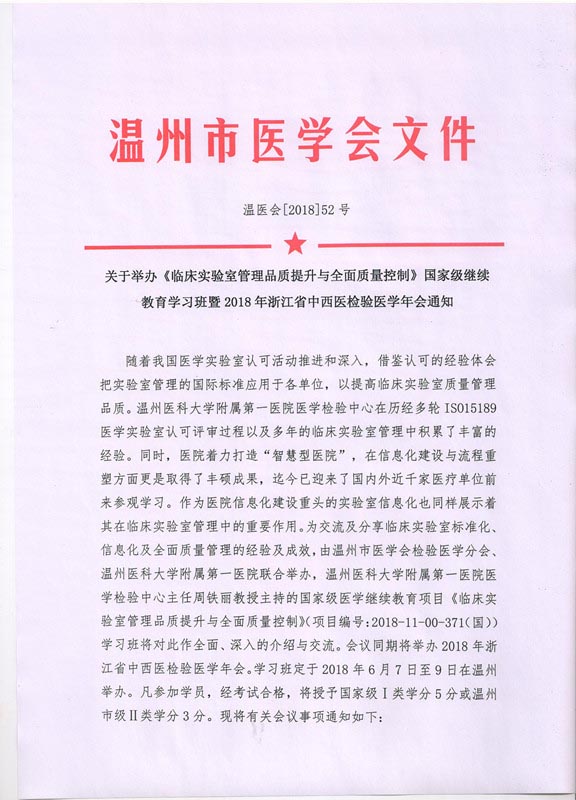 关于举办《临床实验室管理品质提升与全面质量控制》国家级继续教育学习班暨2018年浙江省中西医结合检验医学年会通知