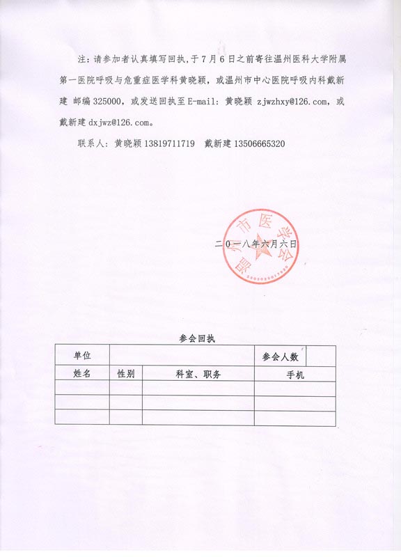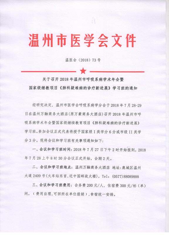 关于召开2018年温州市呼吸系病学术年会暨国家级继教项目《肺科疑难病的诊疗新进展》学习班的通知