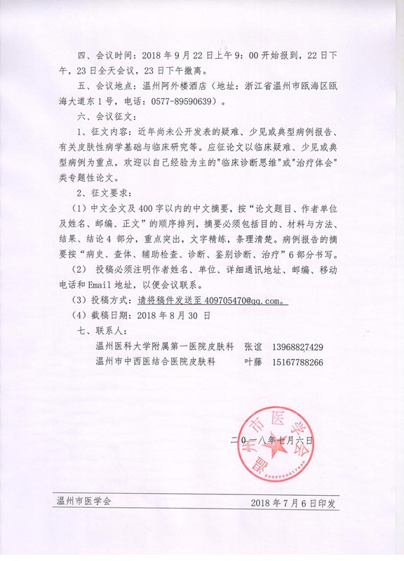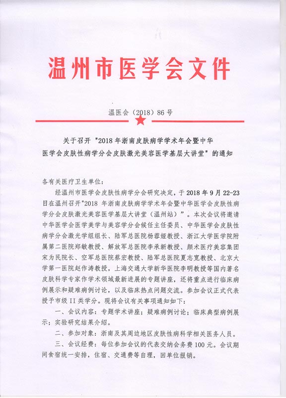 关于召开“2018年浙南皮肤病学学术年会暨中华医学会皮肤性病学分会皮肤激光美容医学基层大讲堂”的通知