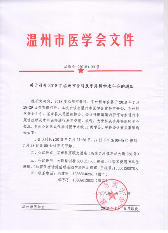 关于召开2018年温州市骨科及手外科学术年会的通知