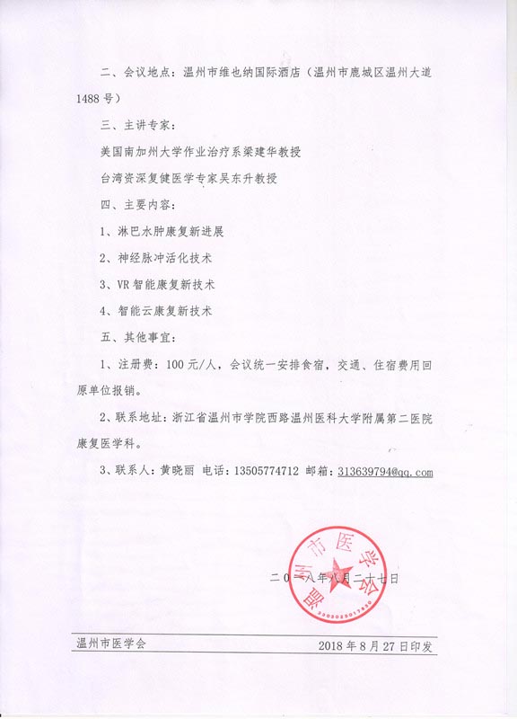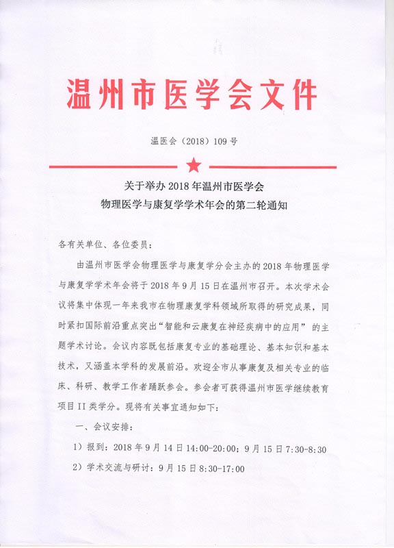 关于举办2018年温州市医学会物理医学与康复学学术年会的第二轮通知