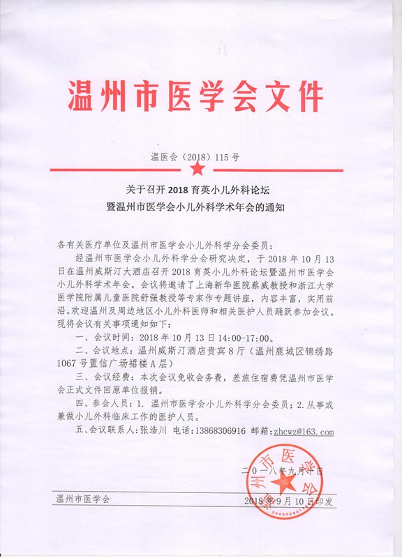 关于召开2018育英小儿外科论坛暨温州市医学会小儿外科学术年会的通知
