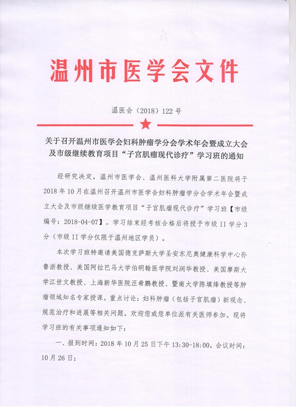 关于召开温州市医学会妇科肿瘤学分会学术年会暨成立大会及市级继续教育项目“子宫肌瘤现代诊疗”学习班的通知