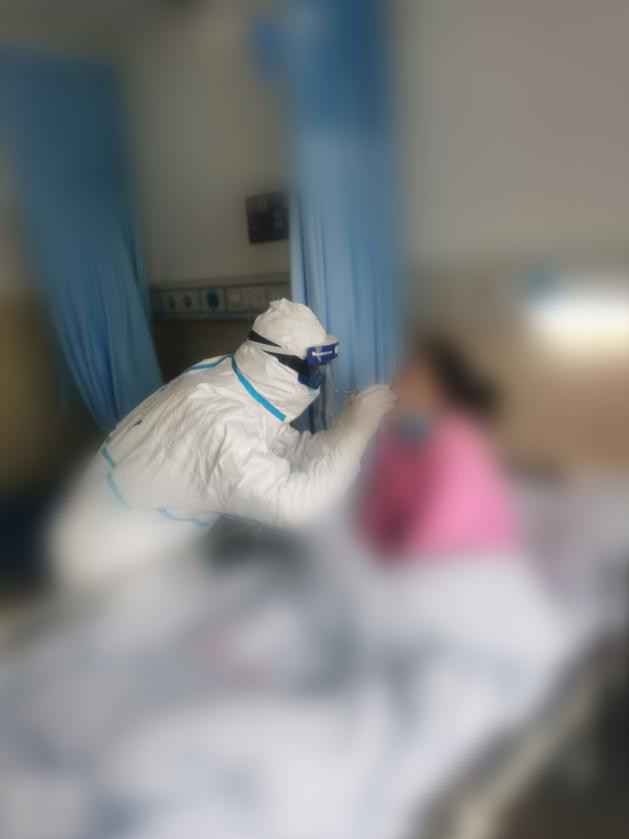 就这样,吴孟沛和他的战友们如愿成为了医院医疗救治第二梯队队员,参与了县中医院集中收治点隔离病房工作,每天穿着厚重的防护装备,忙碌在隔离病房的角角落落。提起在隔离病房里的这些日子,他说自己最难忘的一件事是为一位患者采集标本时的小插曲。在为一名患者采集咽拭子的过程中,患者没忍住,冲他咳嗽了几声。患者非常内疚的说道,医生我不是故意的,他反而安慰的说道:“没事,这是正常的咽反射,我们都有防护,没关系的。” 每名医护人员都明白这个操作的危险性,但他为了消除病人本已经很脆弱的神经,装作一副惹无其事的样子,继续采集着咽拭子标本。因为他知道做为一名医生不仅仅是去治疗肉体上的病痛,精神上的抚慰也是不可或缺的。他的妻子叮嘱他要小心照顾好自己,他总是说:当我走进隔离病房,就没有时间想有没有危险,唯一的念头是做好本职工作让每一位患者能在我手中安然无恙,健健康康地走出这隔离病房。和儿子视频的时候,他总是扭头不愿意让儿子看到自己眼框湿润,鼻子泛酸的样子。因为他希望他在儿子的心目中的形象是坚强的,有担当的,伟岸的,显然他做到了。他不仅是一位好父亲,也是一位好医生,为隔离病房的患者们带去了沛雨甘霖。