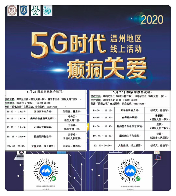 6月26、27日晚,由温州市医学会神经病学分会携手温州医科大学附属第一医院神经内一科、温州医科大学附属第二医院儿童神经科、瑞安市人民医院神经内科及乐清市人民医院神经内科开展了温州地区2020年“6·28国际癫痫关爱日”线上患者教育科普活动。今年癫痫关爱日的主题是“5G时代,癫痫关爱”。本次患者教育科普活动由温州地区癫痫专科多位资深医护人员共同参与讲座,和患者线上交流。