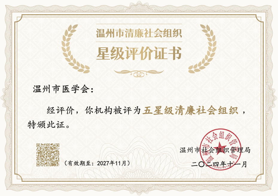 近日,学会荣获温州市五星级清廉社会组织称号。清廉建设是全面加强社会组织党的建设的重要内容,也是社会组织健康发展、行稳致远的根本保证。