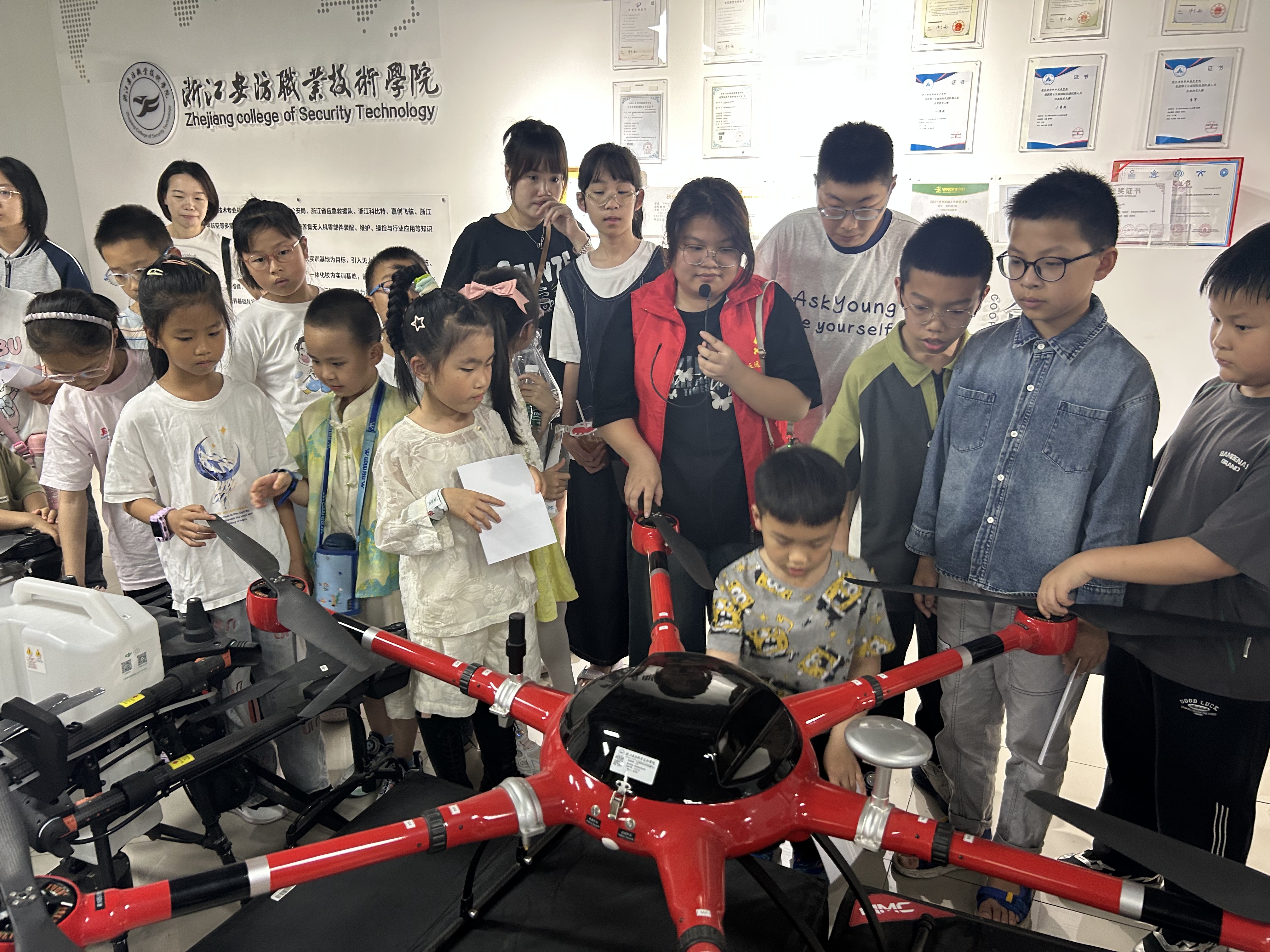5月25日下午,在温州市安防学院晴朗的上空,孩子们亲手按下起飞按钮,看着自己搭建的无人机缓缓升空,眼中闪烁着惊喜与激动的光芒。这是浙江安防职业技术学院无人机科普基地,志愿者将无人机原理拆解开来,耐心地向孩子们介绍电机、螺旋桨、飞控系统等部件,理论课上,伯努利定律通过风洞实验可视化;实操环节,孩子们在模拟器中经历数十次“坠机”后,终让无人机稳定悬停。同学们不仅掌握了无人机飞行技巧,更点燃了他们对科技探索的热情,在实践中锻炼了动手能力与解决问题的能力,收获满满。