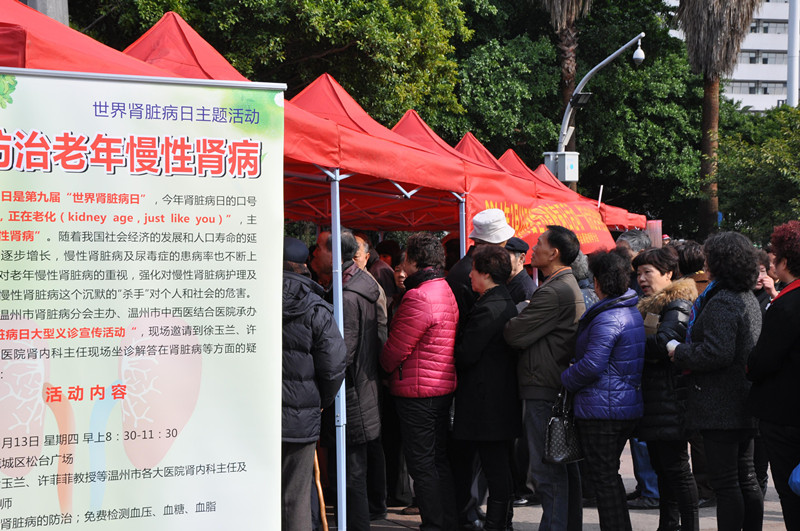 3月13日早上于市区松台广场举行大型义诊活动,温州各大医院,如附一医、附二医、育英儿童医院、市中心医院、市人民医院、市中医院、市中西医结合医院以及鹿城医院等医院的肾病专家及营养师、护士出席活动,对现场群众义诊并答疑,并免费测血压、血糖、血脂以及发放宣传资料等。很多市民都是慕名找专家看病,平时这些专家一号难求,现在在家门口就可以看病,而且交流时间更多、服务更加周到,大家都非常满意。 当日下午,于市中西医结合医院举行肾脏病科普讲座,有附一医许菲菲教授的《老年人药物性急性肾损伤》及中西医院赵润英主任医师的《慢性肾脏病的早期筛查》等内容,并现场检测骨密度、血糖等。240余名市民参加讲座并咨询,收到了令人满意的效果。