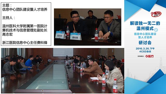 绍兴市人民医院信息处处长钟初雷、台州医院计算机中心主任陈凌平、浙江大学医学院附属第一医院信息中心主任周敏、宁波市第一医院信息中心主任吴斌、温州医科大学附属第二医院规划发展处处长陈朝晖、温州医科大学附属第一医院计算机技术与信息管理处副处长高志宏共同参与了此次话题讨论。