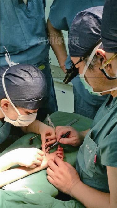 当天下午,温医大附二院丁健博士和北京整形医院的臧孟青,还为5岁的先天性手部畸形贫困患儿张某等做了手术。