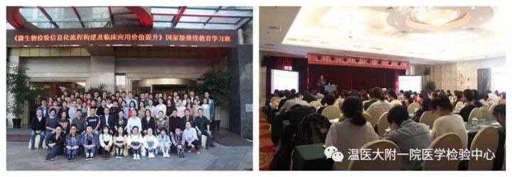 由温州医科大学附属第一医院和温州市医学会检验医学分会联合举办的《微生物检验信息化流程构建及临床应用价值提升》国家级继续教育学习班于2017年11月3日在温州国贸大酒店正式拉开帷幕。温医大附属一院医学检验中心微生物检验室充分利用医院和科室先进的信息化建设平台,在信息化改进和优化传统微生物检验流程过程中取得了一定的成效,为分享经验、加强交流,特举办此次学习班。学习班围绕“微生物检验信息化及临床应用”的主题,与大家共同分享在微生物检验信息化流程构建过程中积累的经验,并邀请了国内各领域专家从不同视角带来一系列精彩的专题报告。