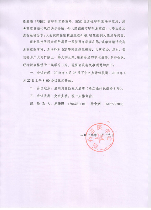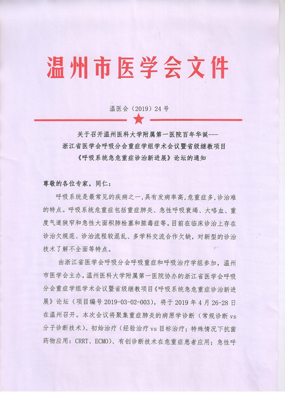 关于召开温州医科大学附属第一医院百年华诞---浙江省医学会呼吸分会重症学组学术会议暨省级继教项目《呼吸系统急危重症诊治新进展》论坛的通知