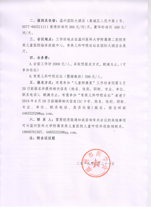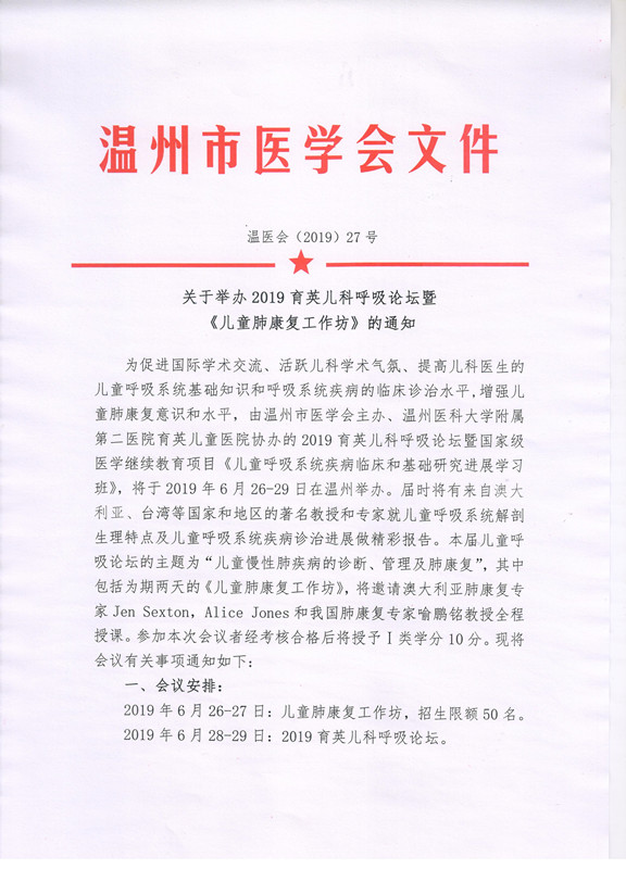 关于举办2019育英儿科呼吸论坛暨《儿童肺康复工作坊》的通知