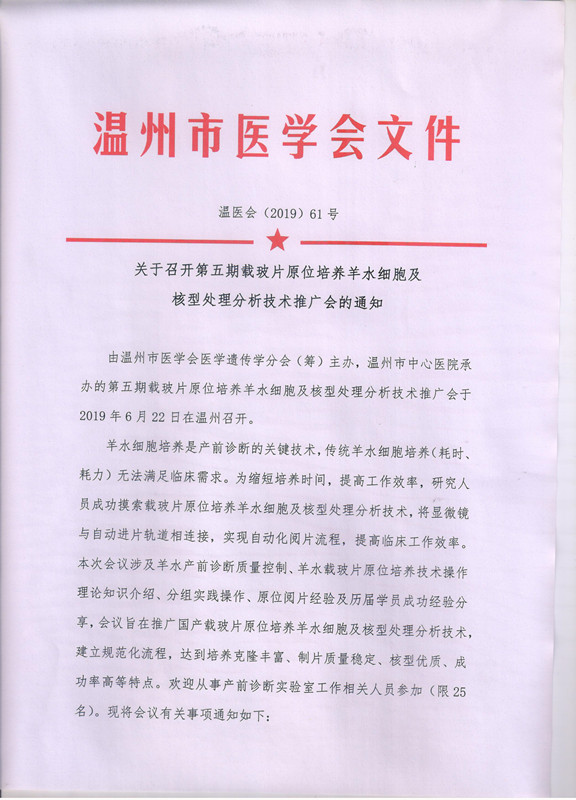 关于召开第五期载玻片原位培养羊水细胞及核型处理分析技术推广会的通知
