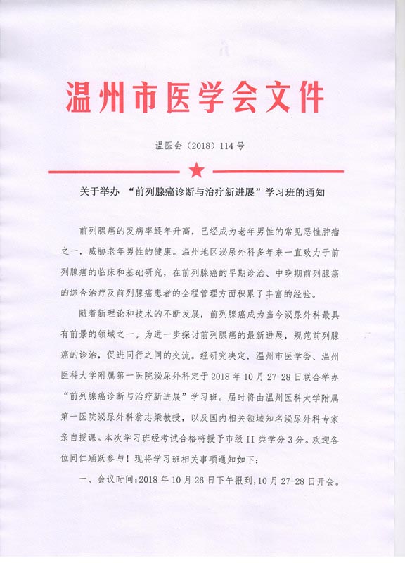关于举办“前列腺癌诊断与治疗新进展”学习班的通知
