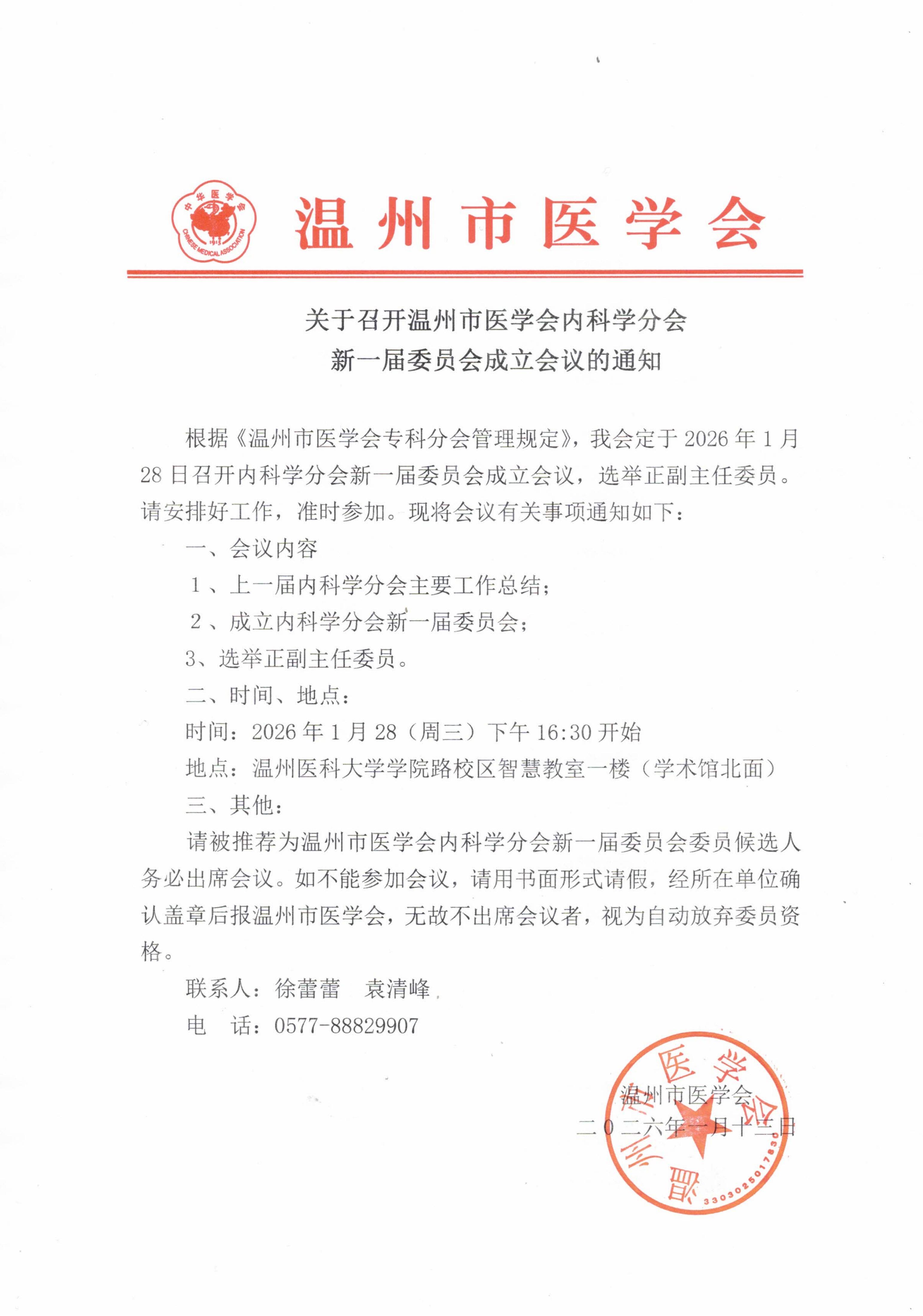关于召开温州市医学会内科学分会新一届委员会成立会议的通知