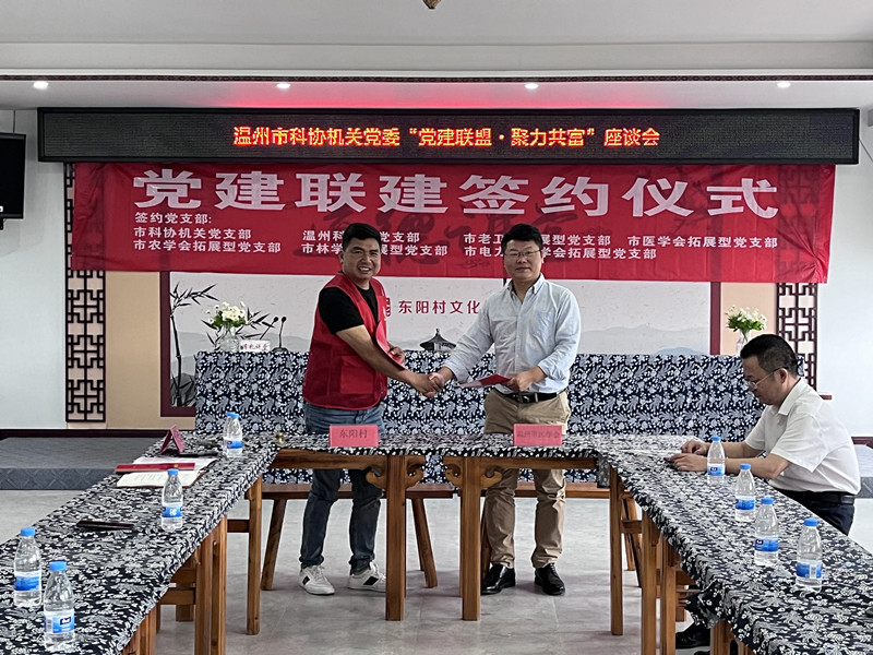温州市科协党组成员、副主席戴本云带领市科协机关党支部、市科技馆党支部和市医学会、市老卫协、市林学会、市农学会、市电力工程学会5支拓展型党支部赴苍南县灵溪镇东阳村开展“牵手帮共富”活动,分别与东阳村党支部签订党建联建协议书,围绕共富目标开展政策指导、创业培训、技术服务、靶向帮扶等活动。